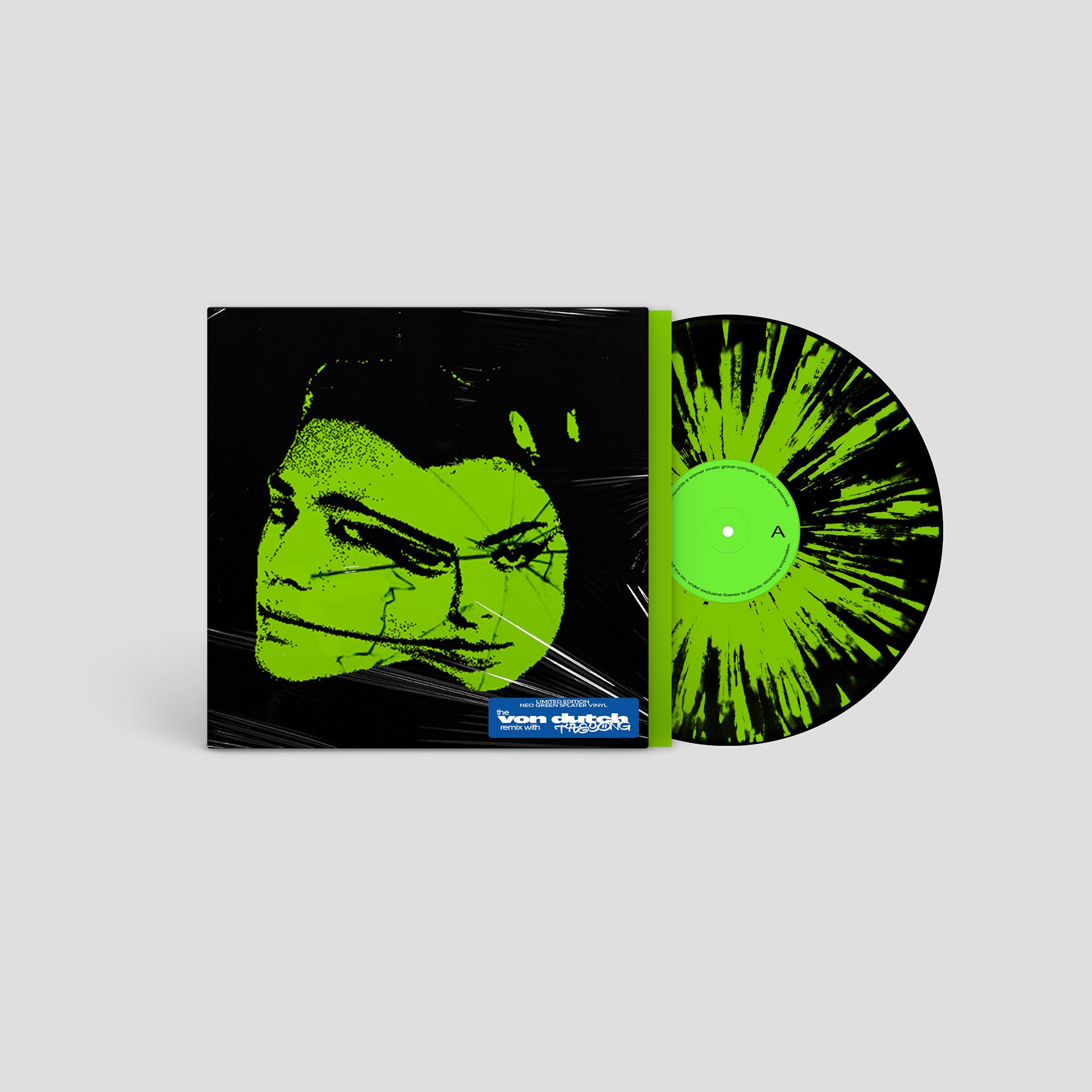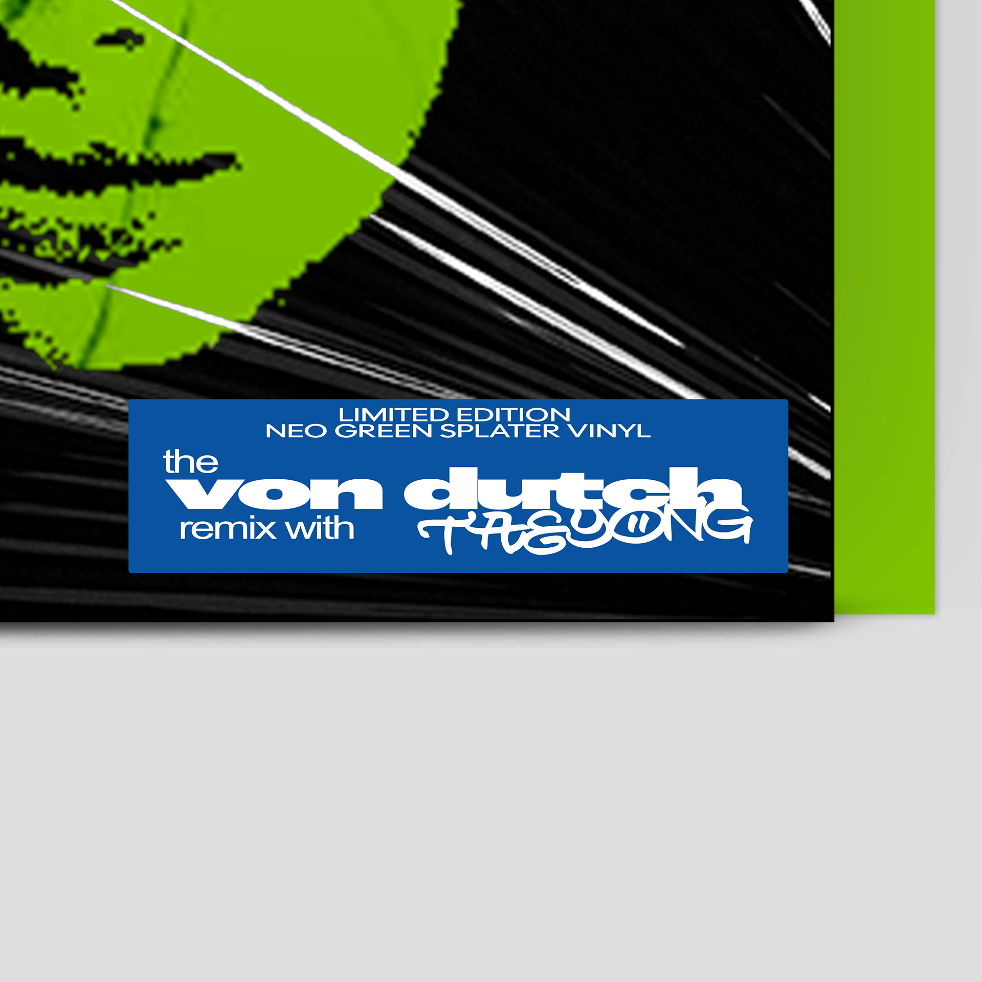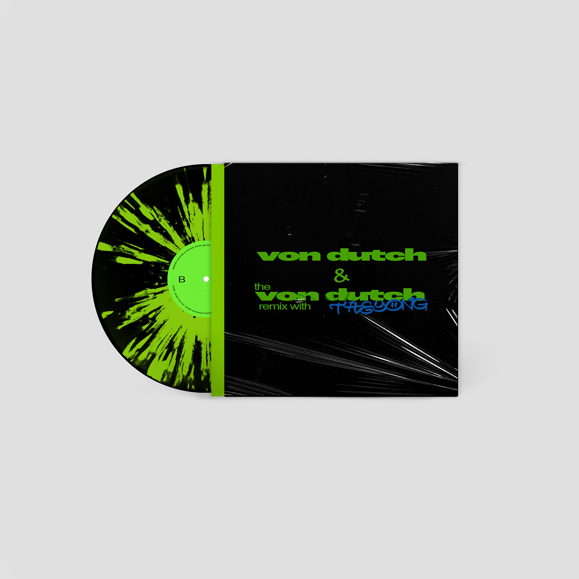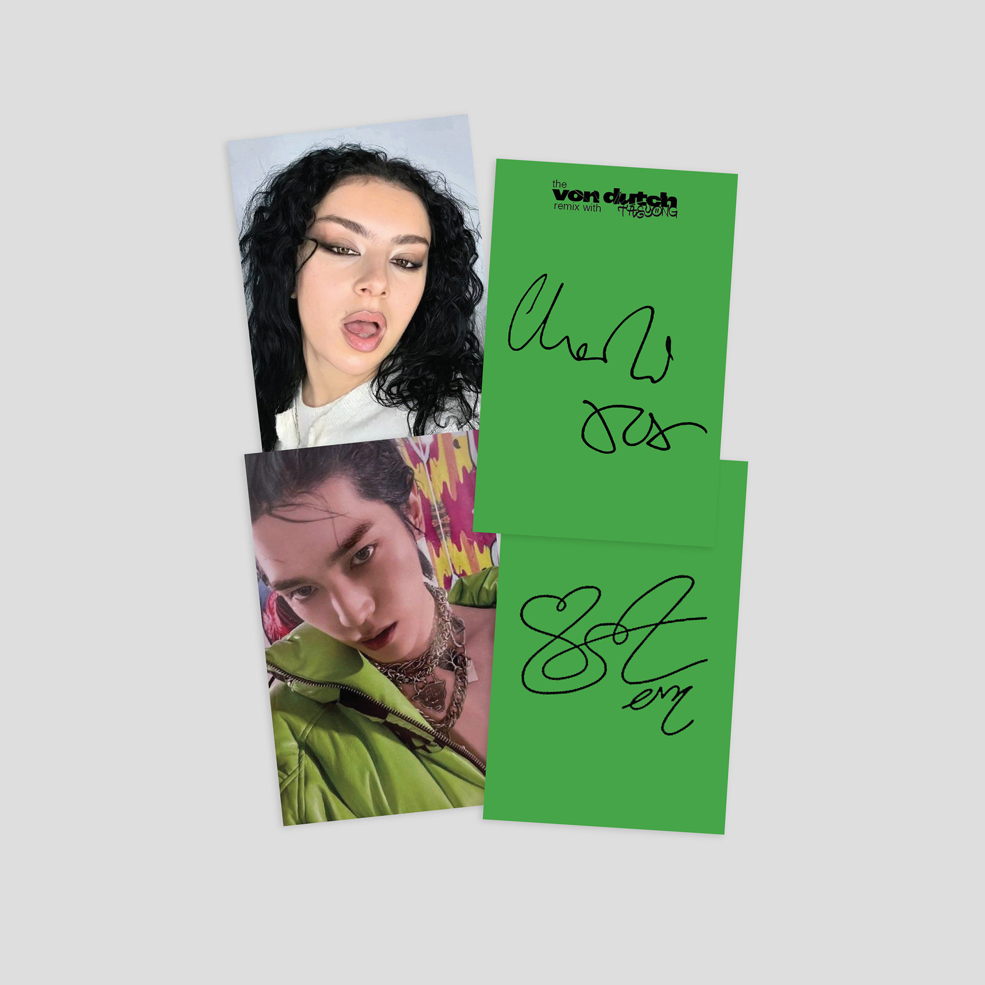 Inspired by Charli XCX’s remixes of her song, “Von Dutch,” I wanted this project to portray another remix with a featured artist. I chose the artist TAEYONG, who is a Korean singer, rapper, and leader of the group, NCT. Both artists have similar aesthetics, surrounding loud, chaotic party scenes. I merged the artist’s faces together, portraying their individual selves while also highlighting this collaboration. I also added a shatter effect to reference the “Von Dutch” music video, and a halftone effect to give the design a grungy look. The type used for the design remained fairly limited, with “Von Dutch” having the heaviest weight, “TAEYONG” being written in graffiti, and the rest being in the same font as Charli’s “Brat” album. The color palette stayed limited as well, utilizing the green from the “Brat” album, while including a deep blue. I felt that it was fitting to include photocards for this project, as many Korean idols do the same, and makes the vinyl more special for fans.